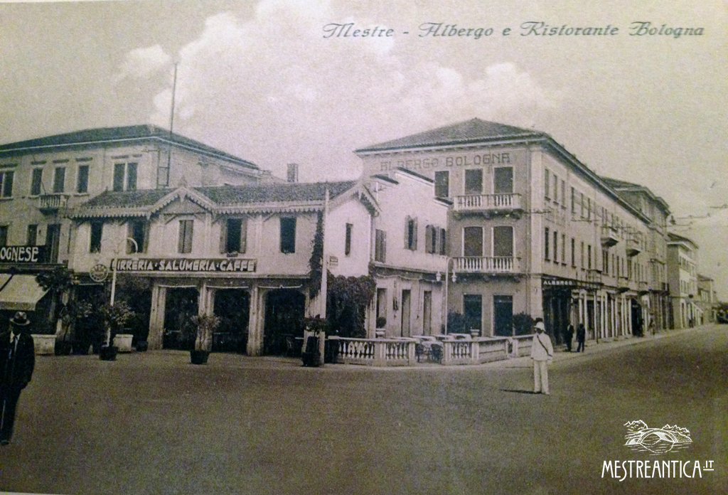 Rara cartolina di una serie 1925 non viaggiata. Siamo all’angolo Via Piave- Viale della Stazione, il soggetto ritratto è il complesso “di bolognesi”: Trattoria “Al bolognese”, l’annessa drogheria/salumeria/birreria e, nella stessa posizione di oggi, l’albergo “alla città di Bologna”.