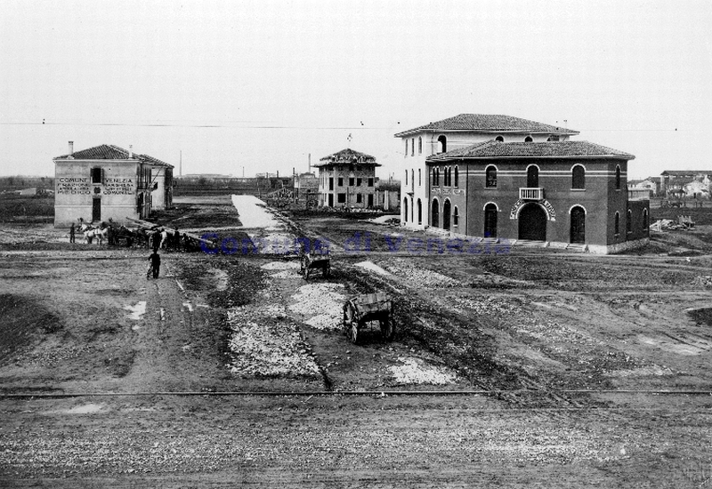 1921. Viene gettata la sede stradale per la realizzazione di Via G. Durando a Marghera, ai piedi del cavalcavia. La casa ottocentesca sulla destra, allora rossa, ora è grigia e il terrazzino sulla facciata non esiste più. Ecco lo stesso scorcio oggi