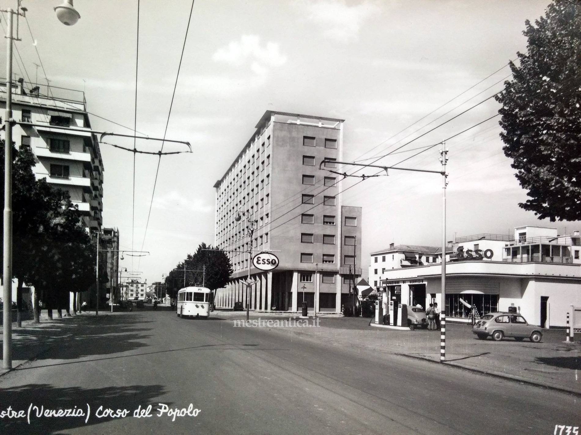 Bellissima e rara cartolina viaggiata 29-3-1962. Un Corso del Popolo (allora) deserto. Siamo all’altezza dell’incrocio con via A. Costa, guardando verso Piazza XXVII Ottobre. Come si vede, all’epoca esisteva all’angolo una stazione di rifornimento Esso; sul luogo, un benzinaio è effettivamente sopravvissuto fino a pochi anni fa.