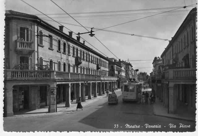 La filovia si ferma in una Via Piave deserta e non trafficata come al giorno d’oggi.