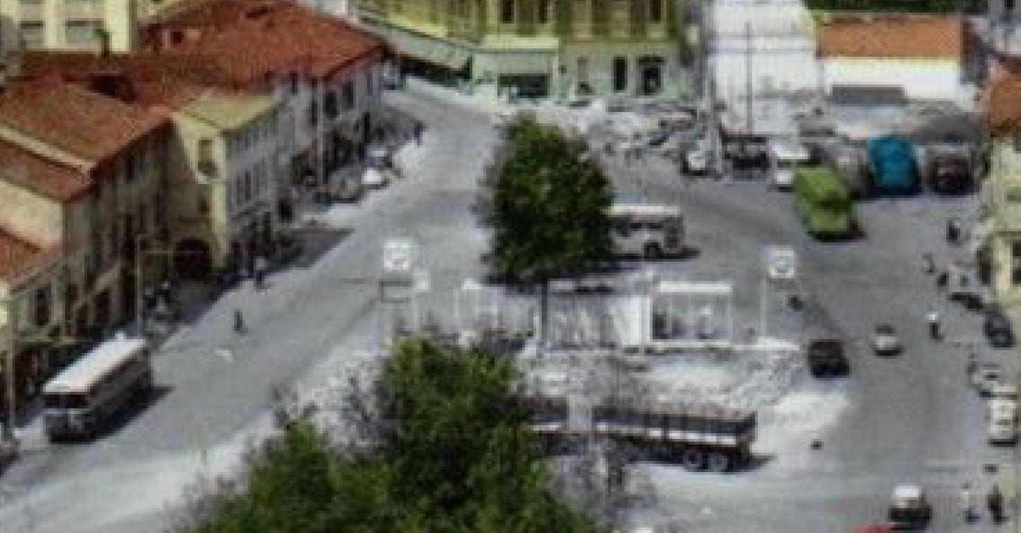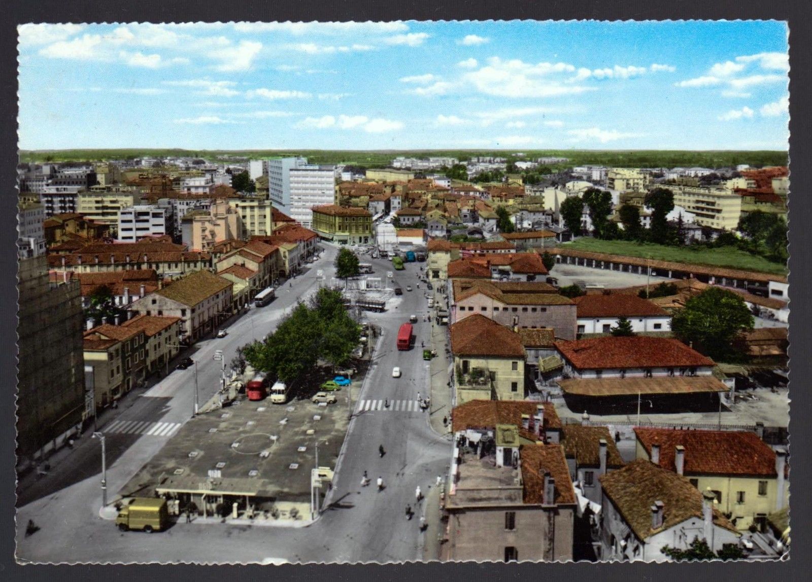 Bella immagine, evidentemente colorata su un esistente bianco e nero, di una Piazza Barche in via di trasformazione dalla vecchia fisionomia all’attuale, circondata da palazzoni figli delle lottizzazioni dei ’60. E qui si vede nettamente sulla sinistra il palazzo angolo Corso del Popolo in via di costruzione. In Via C.Colombo presenziano ancora le case ottocentesche di pescatori e barcaioli, con la ditta di spedizioni dei F.lli Piccin (la tettoia e lo spiazzo). Sul fondo della foto ancora esistente -per pochi anni ancora- l’edificio ex Stabilimento dolciario Taboga che ospita in questi anni già i Magazzini Coin.