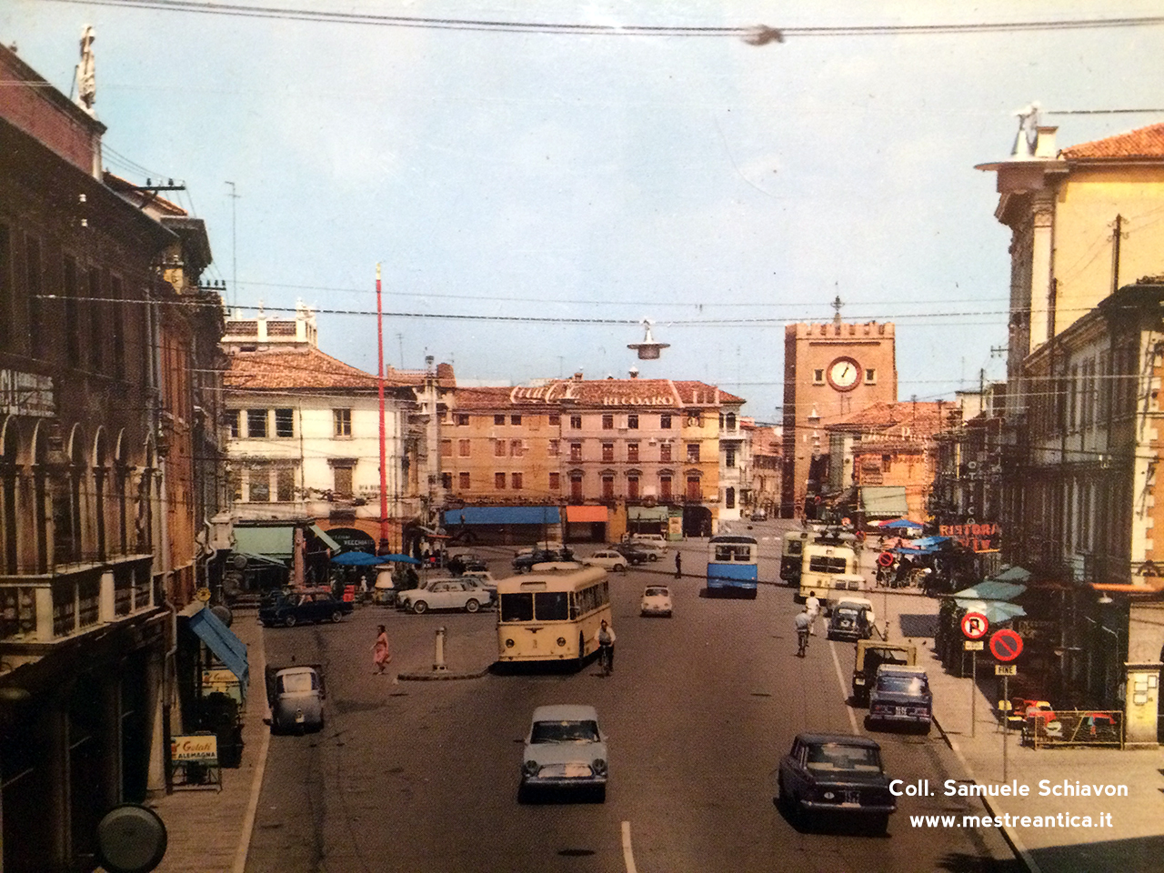 Cartolina viaggiata 20/7/1966. Una Piazza Ferretto a metà degli anni viva di veicoli pubblici, privati e commerciali.
