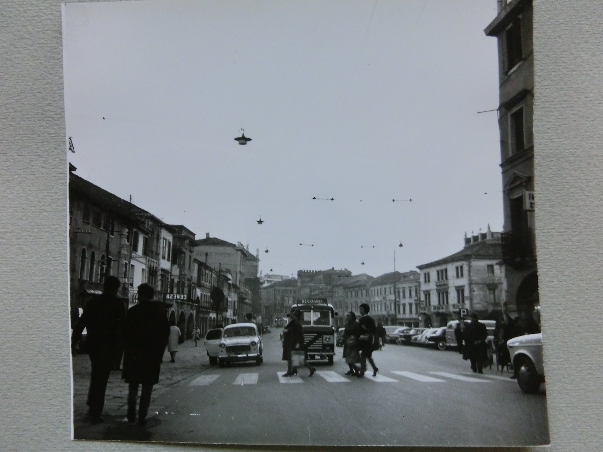Veduta di una Piazza Ferretto trafficata…siamo negli anni ’60 e la visuale è presa dal lato della Torre dell’orologio