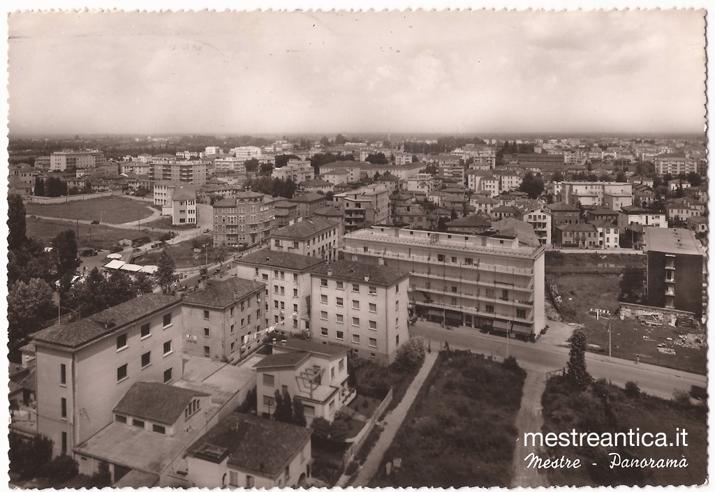 Foto panoramica ritraente in primo piano la fine di Viale San Marco verso l’incrocio con Via Colombo. Interessantissimo notare l’area dell’ex Parco Ponci, colmata ma non ancora edificata, aldilà delle Scuole.