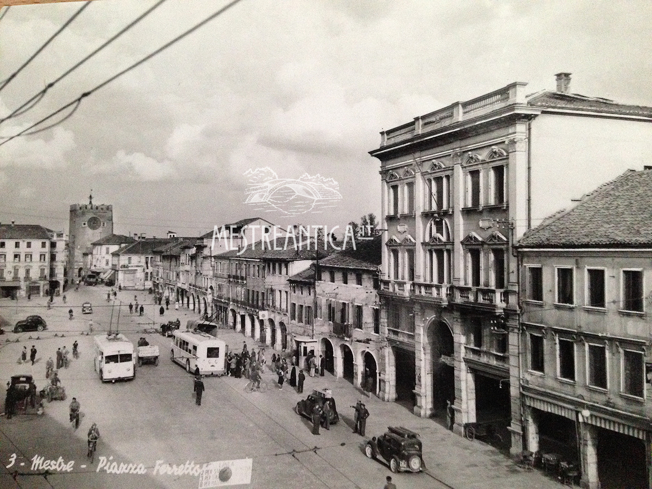Bellissima immagine piena di dettagli di una Piazza Ferretto tra fine anni ’40 e primi ’50. La cartolina è viaggiata 24/1/1957 ma con ogni probabilità la foto si riferisce a qualche anno prima.