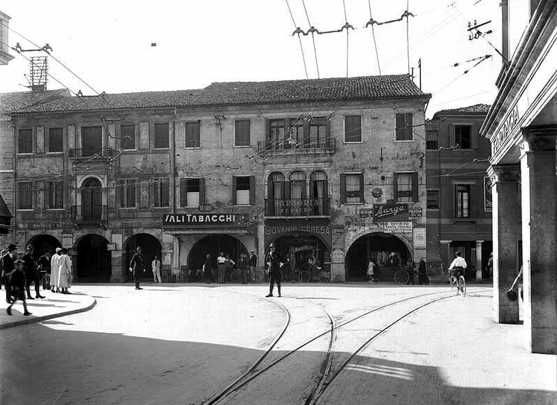 Eccezionale spaccato di vita mestrina del 1933: siamo al Ponte della Campana, interessante notare i vigili a centro strada a regolare il flusso di traffico dell’epoca. Interessanti anche le insegne appese, con marchi e reclame.