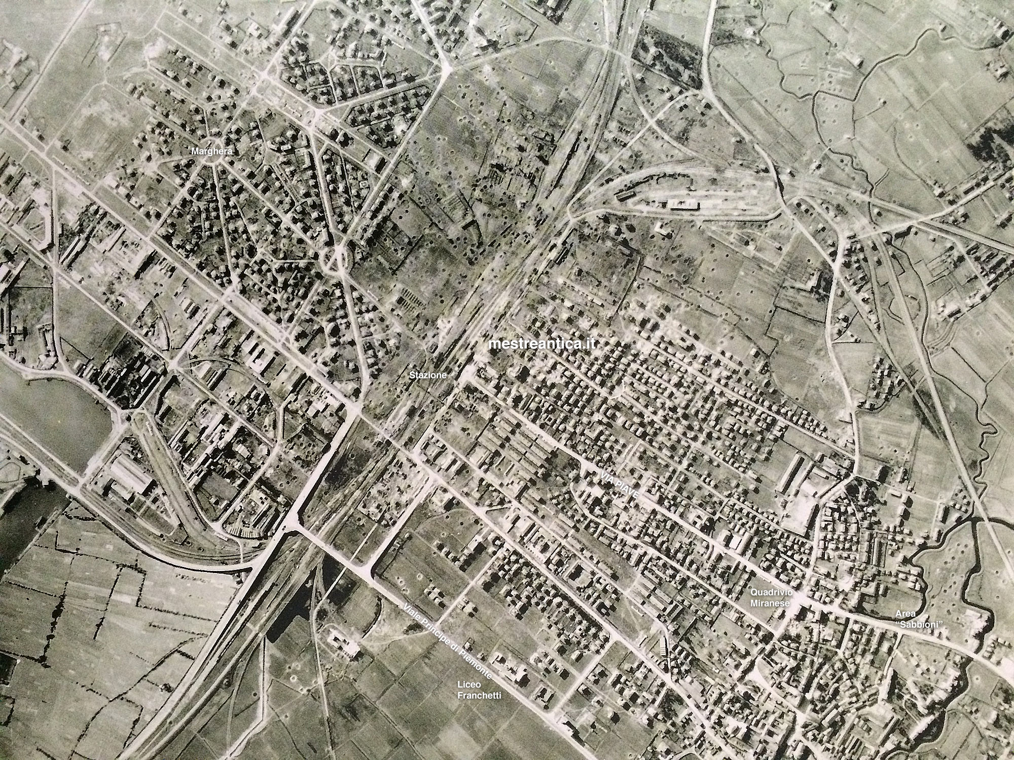 Ancora Mestre sotto le bombe della Seconda Guerra Mondiale. Eccezionale testimonianza aerea (Foto RAF): nella ripresa, la zona dal centro verso Sud e quindi quartiere Piave – Corso del Popolo, Stazione e Marghera (verso sinistra). Si notano chiaramente i crateri delle bombe alleate lanciate sull’abitato e in larga parte sulle infrastrutture strategiche, quindi la stazione stessa ma non solo. La foto è notevole perchè mostra chiaramente lo sviluppo urbano in quell’anno: il Liceo Franchetti esistente da solo 4 anni, un Corso del Popolo ancora deserto senza palazzi e abitazioni, l’area di Via Verdi – Via Miranese ancora a prati verdi.