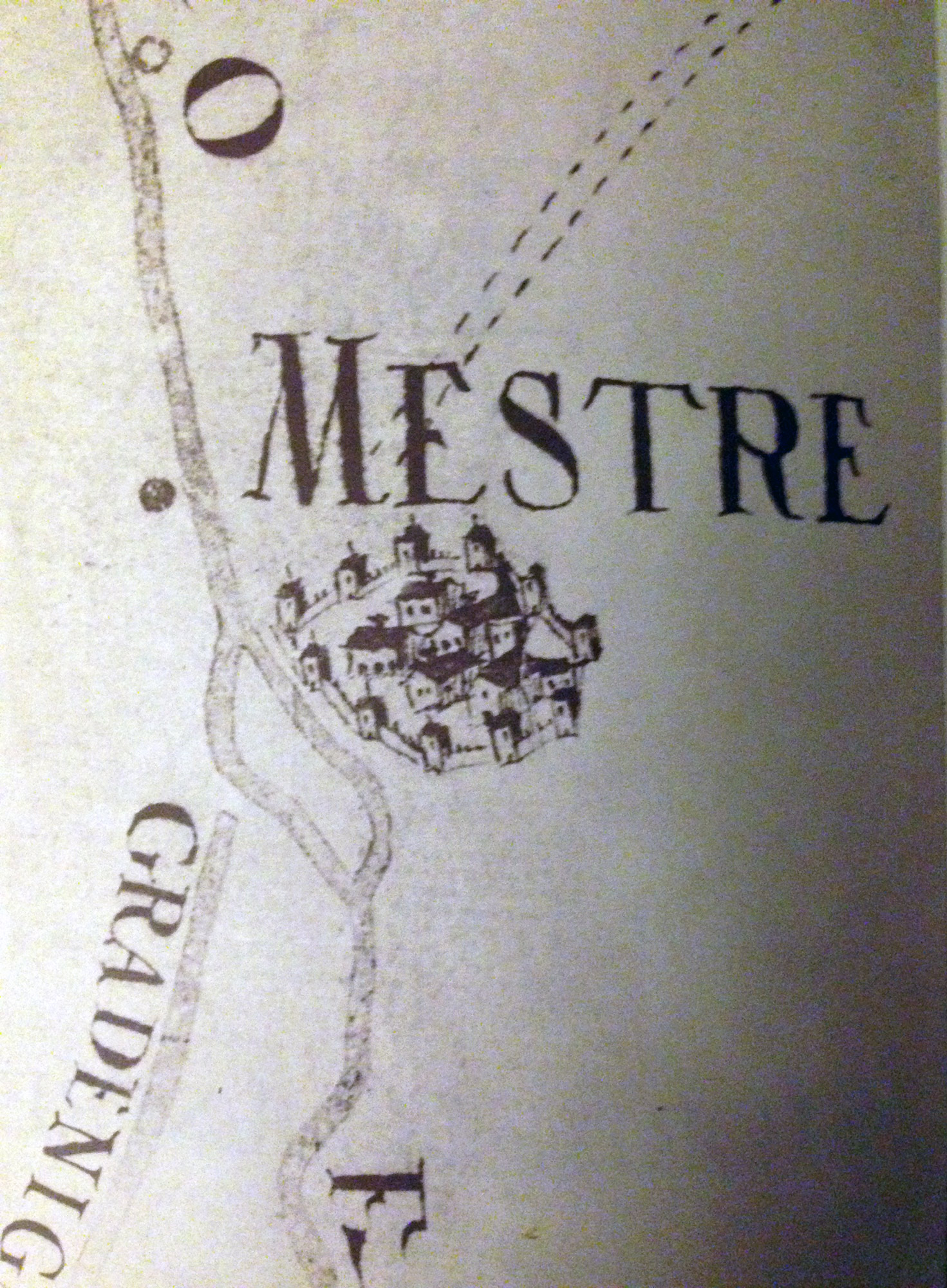 Il secolo dovrebbe essere il XVII. Il Castello con le sue torri: quella più a sinistra nella mappa (orientamento Sud) è la torre dell’orologio, che guarda sul ramo delle Muneghe del Marzenego (ex Musone). La fossa “Gradeniga” è il Canal Salso, già realizzato dai veneziani a quel tempo.