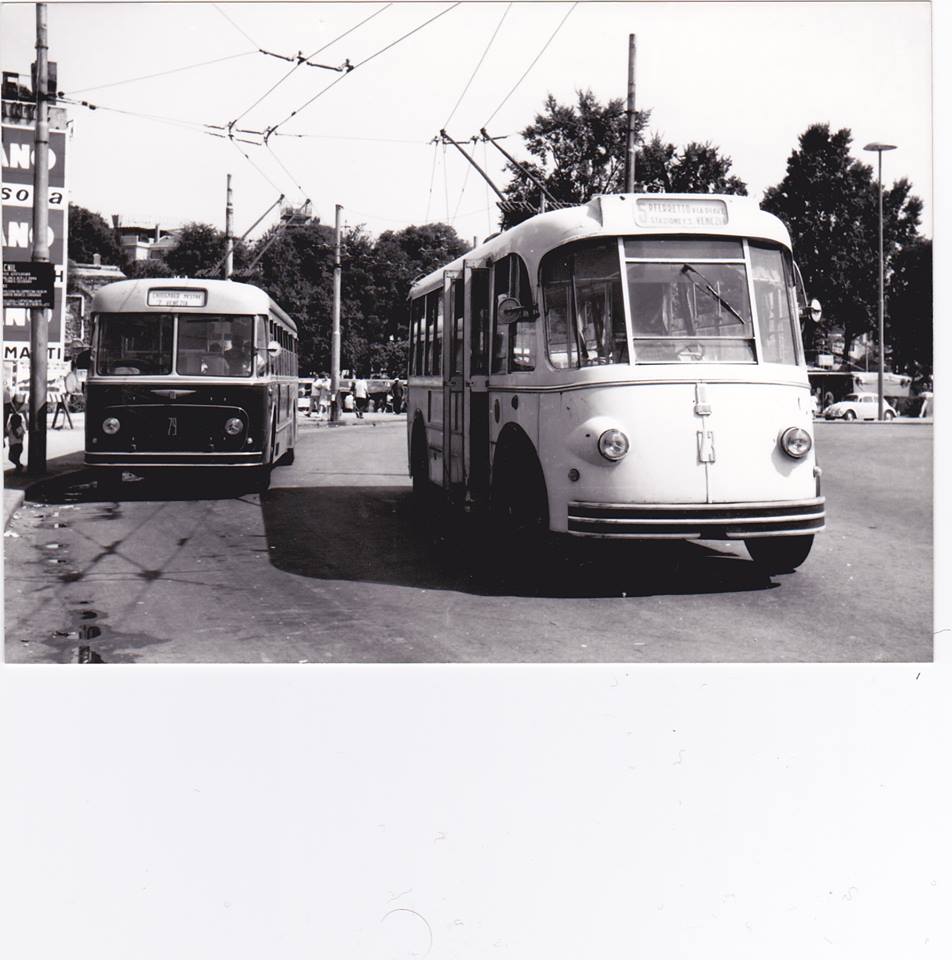 Anni ’50. Autobus di linea fermi in sosta a Piazzale Roma presso l’edificio della biglietteria.