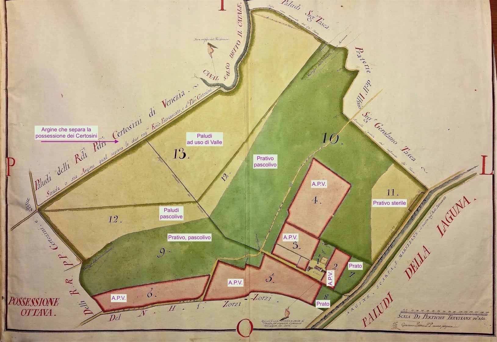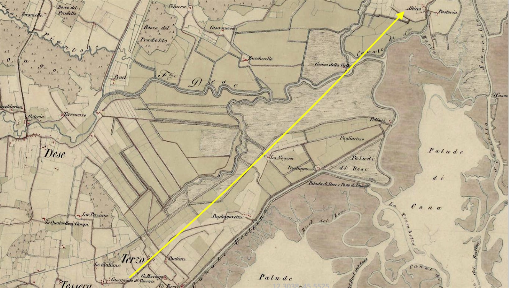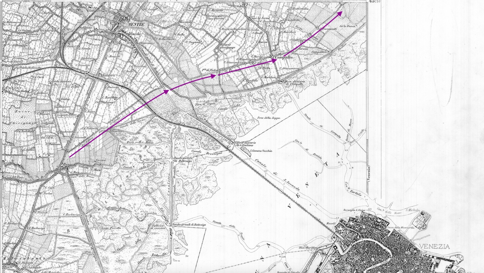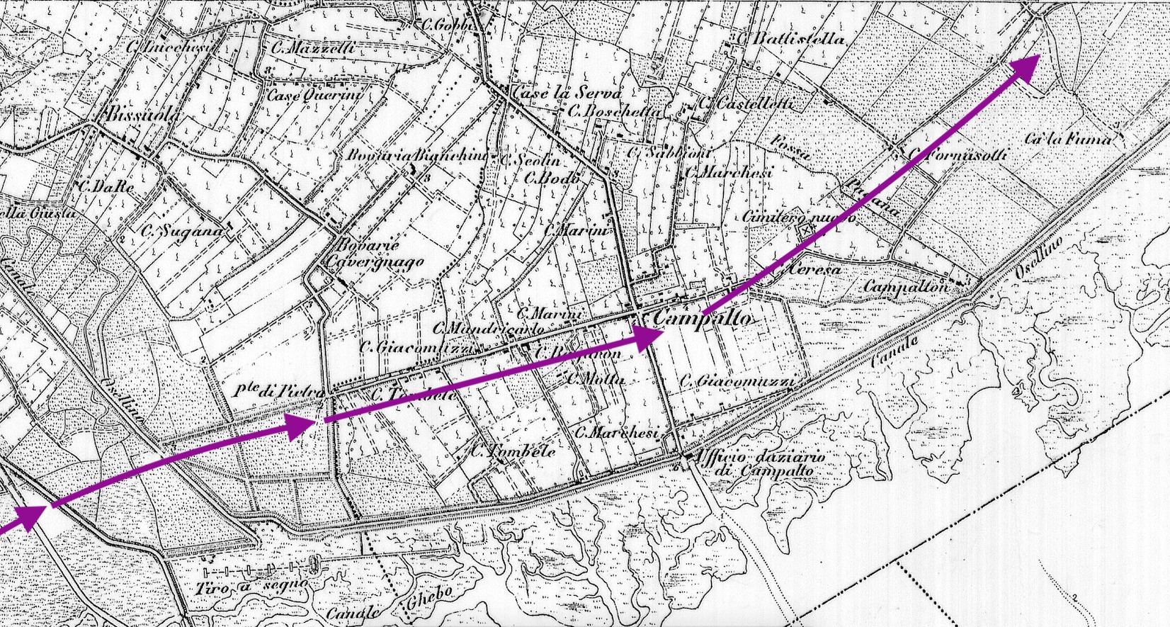 - Cartografia del 1869 con le paludi di Pagliaghetta [ora Cà Noghera]. La strada era quasi del tutto scomparsa e il territorio impaludato