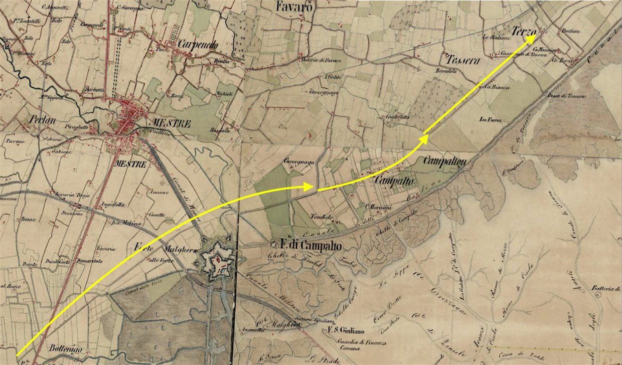 - Carta IGM del 1887. La strada era visibile da Bottenigo verso Campalto. Attraversava Viale S. Marco di Mestre all’altezza del campo sportivo