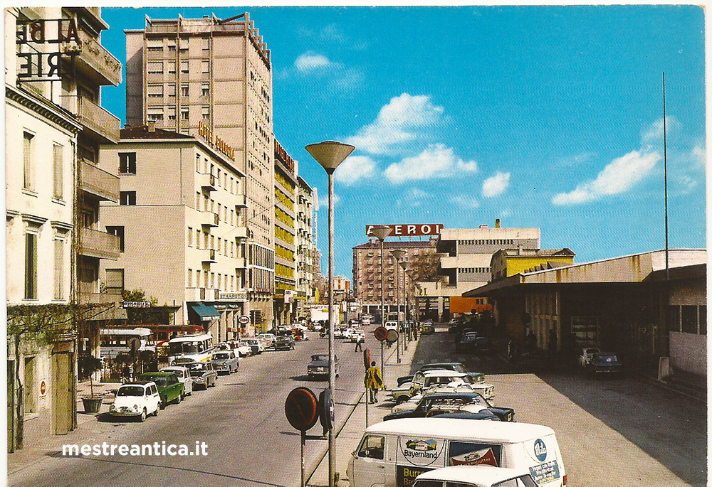 Una bellissima immagine, tra le prime a colori, ritraente la nuova stazione Ferrovie dello Stato. In primo piano furgoncino Fiat 850T “Bayernland”. Sullo sfondo, l’insegna “Aperol” giganteggia sul tetto del palazzone a capo di via Cappuccina.